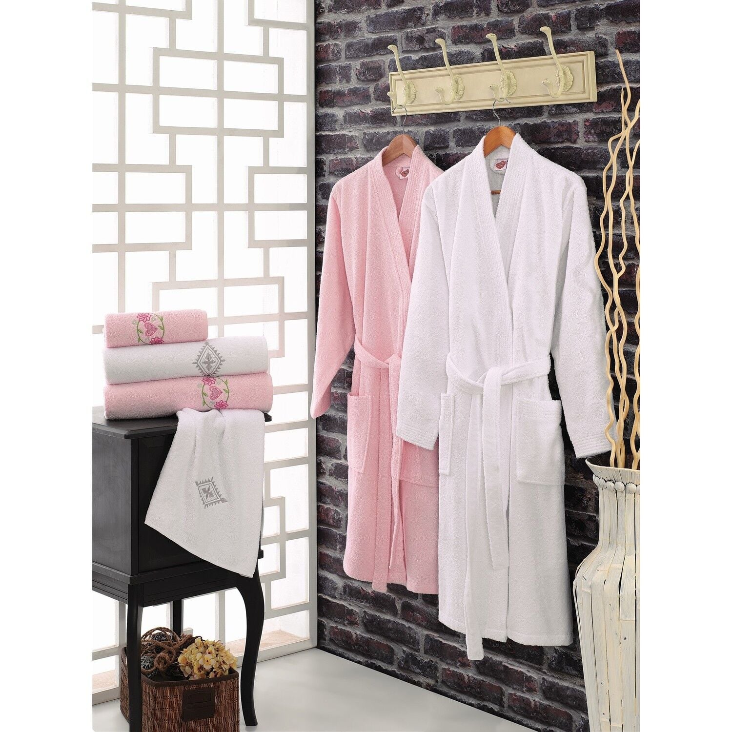 Cotton Box Aile Bornoz Seti Nakışlı Pembe - Beyaz
