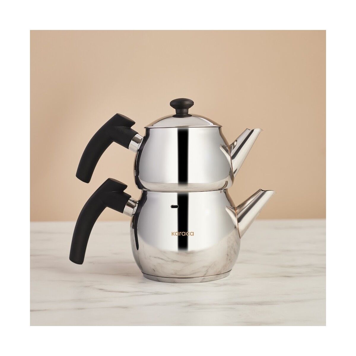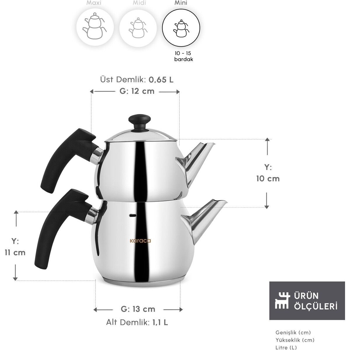 Karaca Adelya Mini Boy çaydanlık takımı, 0,65 litre demlik ve 1,1 litre suluğu ile ideal miktarda çayınızı tam ayarında ve tadında demlemenizi sağlar. Çelikten oluşması sayesinde sağlıklı ve uzun ömürlüdür.