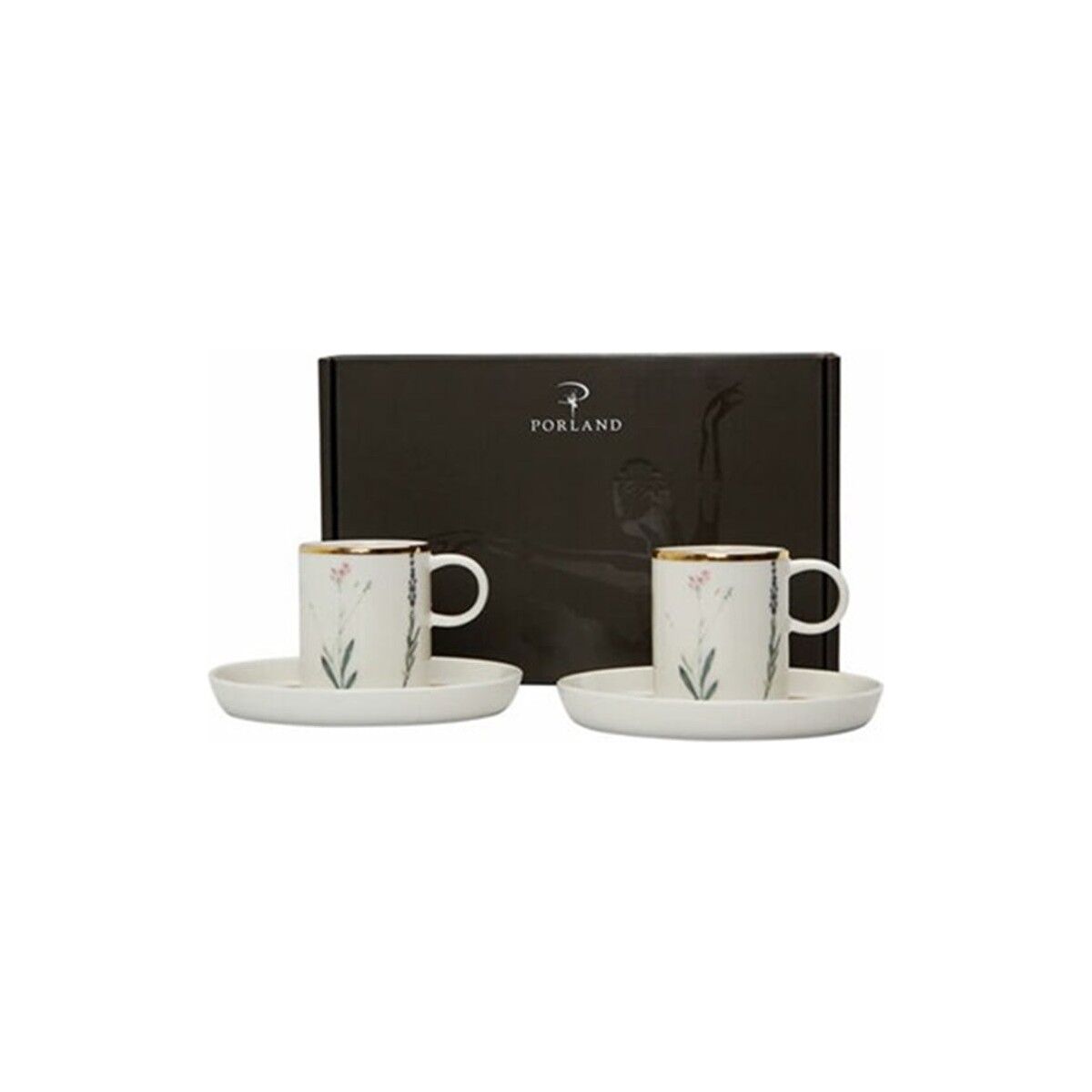 Porland Porselen Kahve Takımı Botanical Desenli 4 Parça Beyaz Kahve ve Çay Sunum Seti