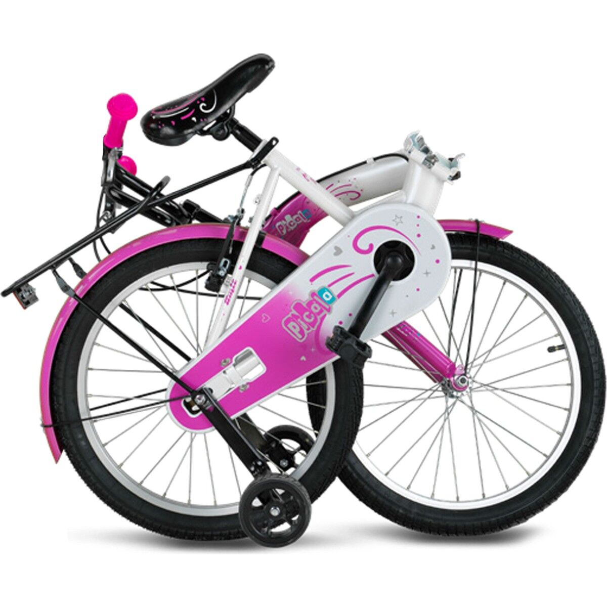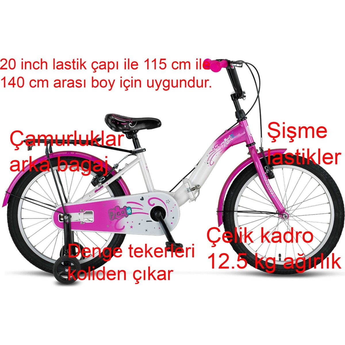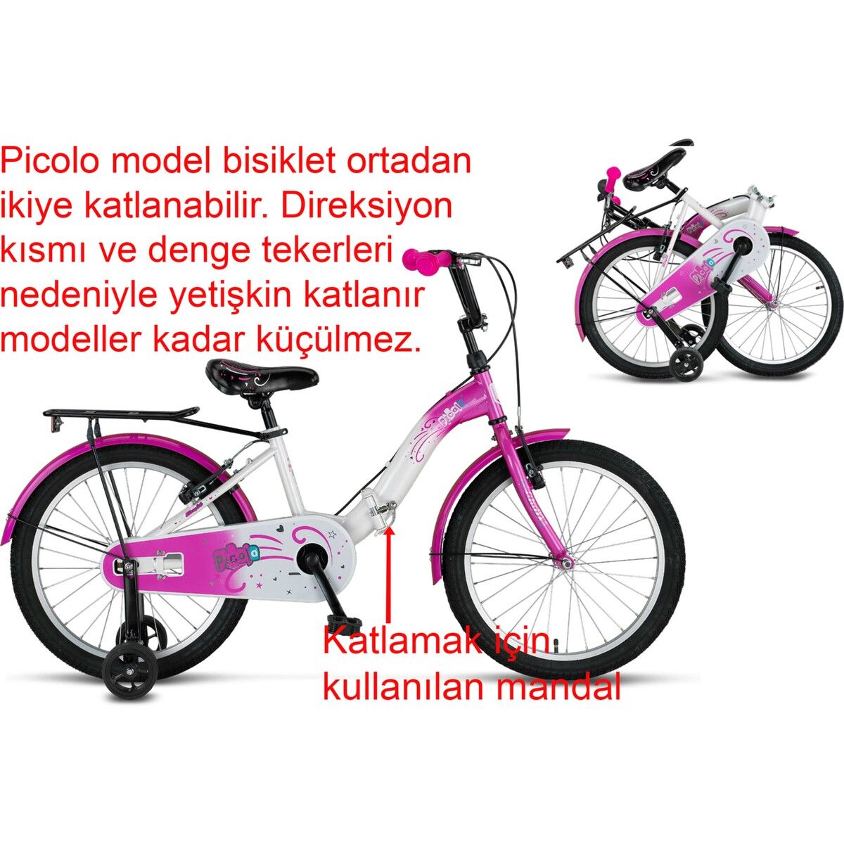 - Koliden görsellerde gördüğümüz denge tekerleri çıkar. Kullanıcı iki teker öğrenene kadar denge tekerleri ile kullandıktan sonra iki teker olarak devam edebilir. Denge tekeri söküldükten sonra bisikleti park halinde ayakta tutan park ayak koliden çıkmaz. Denge tekeri söküldükten sonra ek olarak 20 jant park ayak alınıp taktırılabilir.